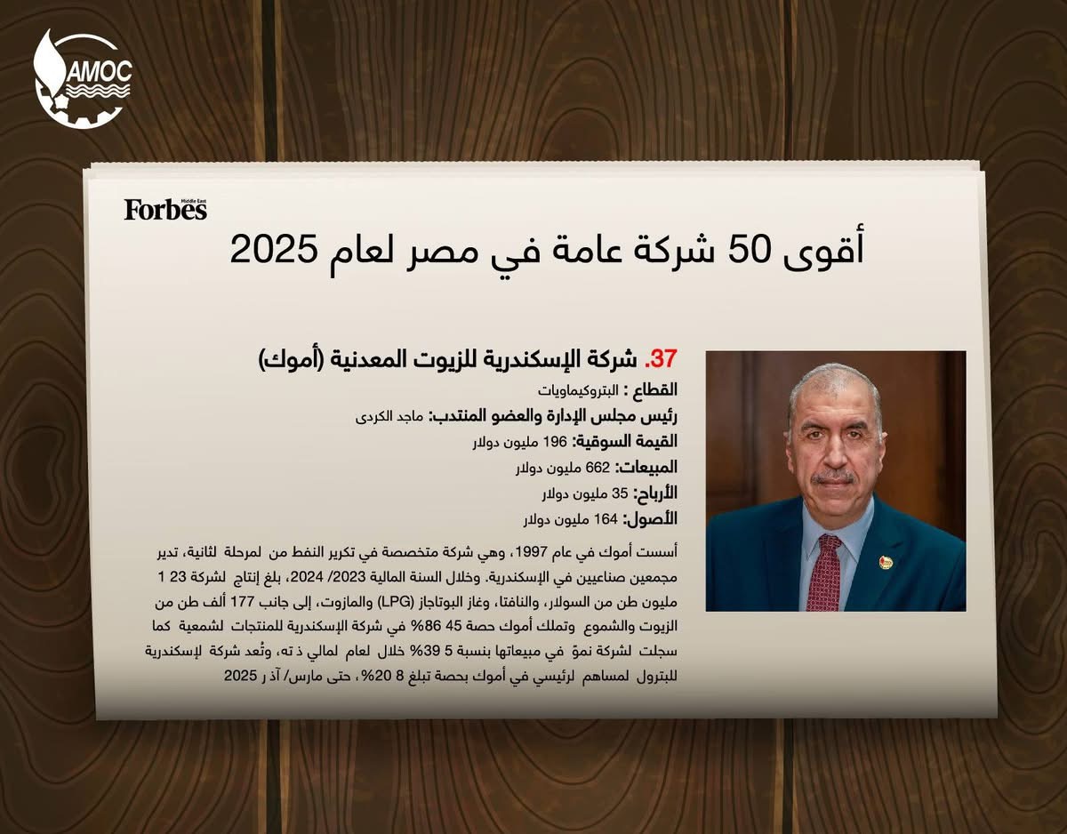 We’re proud to announce that Alexandria Mineral Oils Company (AMOC) has been recognized among Egypt’s strongest publicly listed companies for 2025 for the 4th time ; a testament to our continued growth, resilience and contribution to the energy sector. This achievement reflects the strength of our performance and strategic leadership by Chem. Maged ElKordy, AMOC’s Chairman and CEO, who continues to drive AMOC forward in a fast-changing energy landscape. 2024 marked a standout year for the Egyptian companies. The financial sector led the list, followed by industrials, real-estate and construction. At AMOC, we are proud to be part of this national success story and will diligently continue to deliver sustainable value in Egypt’s energy sector and beyond. #forbes #Forbes2025